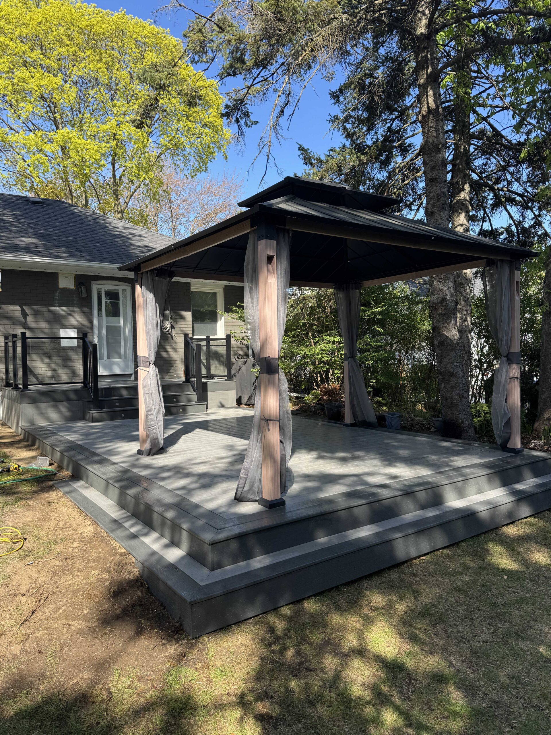 This Milton deck project was completed with a modern finish and a strong, stable structure. We installed the surface boards with clean alignment, built safe stairs, and finished the railings with a polished look. The deck layout was designed for everyday comfort and practical outdoor use. A solid backyard deck upgrade built with durability, clean finishing, and attention to detail.